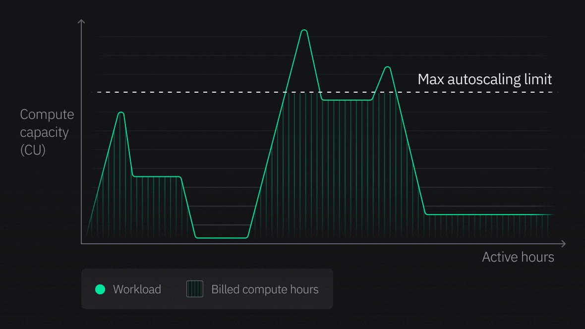 Compute size is measured in CUs. Database branches autoscale from 0.25 to 10 CU based on load and down to zero when inactive.